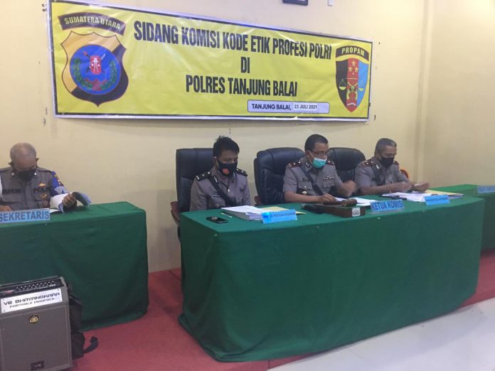BALAINEWS.CO.ID,Tanjungbalai – Polres Tanjungbalai laksanakan sidang komisi kode etik Profesi yang ke III terhadap anggota Polres Tanjungbalai terduga pelanggar kode etik yakni Aipda Arianto Sinaga SH NRP 78060173 jabatan Brigadir diruangan endra dharma laksana pada Jum,at 23/7/21.