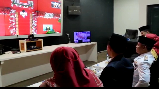 BALAINEWS.CO.ID, Tanjungbalai – Pelaksana tugas (Plt) Wali Kota Tanjungbalai Waris Tholib bersama Plt Ketua TP PKK Tanjungbalai Fatiah Haitami mengikuti Upacara Peringatan Detik-detik Proklamasi Hari Ulang Tahun (HUT) ke-76 Kemerdekaan Republik Indonesia (RI) di Istana Negara Jakarta secara virtual dari ruang Command Center Diskominfo, Kantor Wali Kota, Selasa (17/08/2021) pagi.