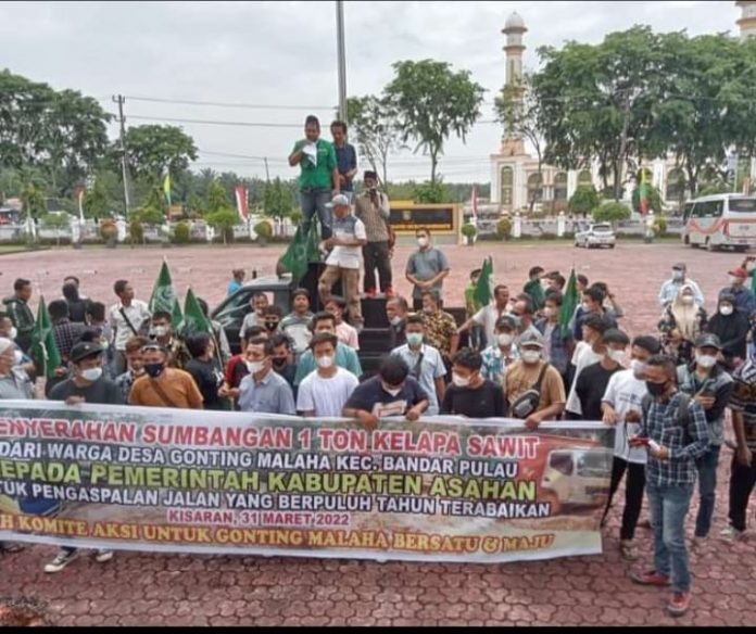 BALAINEWS.CO.ID, Tanjungbalai – Merasa bosan dan tak tahan hanya dapat janji – janji manis dari Pemkab Asahan, Warga Desa Gonting Malaha Kecamatan Bandar Pulau Kabupaten Asahan melakukan Aksi Demontrasi di Depan Kantor Bupati dengan menyumbangkan Satu Ton Tandan Buah Segar (TBS) Sawit kepada Pemkab Asahan untuk perbaiki jalan yang semangkin rusak parah di sejumlah tempat di Asahan, demikian Pantauan Awak Media di Depan Kantor Bupati Asahan pada kamis 31Maret 2022.