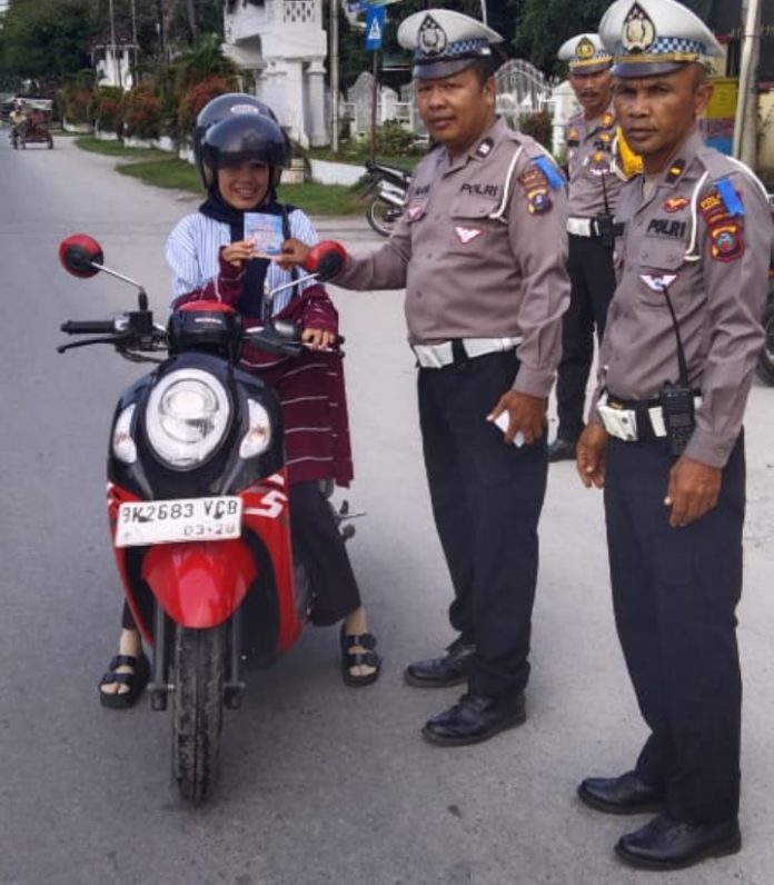 “Melalui brosur dan steker ini kami menghimbau agar masyarakat melengkapi surat surat kendaraan dan mematuhi peraturan lalulintas. “Ucap Kasat.