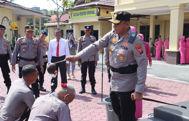 Kapolres Tanjungbalai, AKBP Yon Edi Winara, melantik dua personel Polres Tanjungbalai menjadi perwira menengah (Pamen) dalam upacara kenaikan pangkat pengabdian yang digelar di Lapangan Apel Mapolres, Minggu (1/6/2025) pagi.