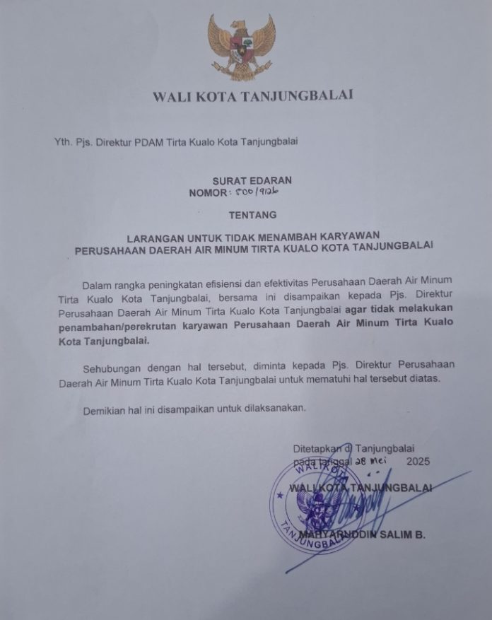Surat edaran nomor 500/9126 tentang larangan untuk tidak menambah karyawan Perusahaan Daerah Air Minum (PDAM) Tirta Kualo Kota Tanjungbalai yang ditandatangani Wali Kota Tanjungbalai, Mahyaruddin Salim B tanggal 28 Mei 2025 menjelaskan bahwa dalam rangka peningkatan efisiensi dan efektifitas PDAM Tirta Kualo meminta agar Pjs. Direktur PDAM Tirta Kualo Kota Tanjungbalai agar tidak melakukan penambahan/perekrutan karyawan Perusahaan Daerah Air Minum Tirta Kualo Kota Tanjungbalai, jelas Rini