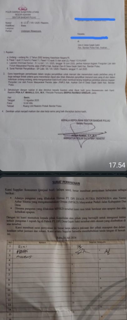 Surat keterangan keberatan para Sopir Truk tentang pungutan tidak sah atau pungli yang dilakukan Humas PT DPI sudah jelas dan beredar luas dimasyarakat juga diketahui pemerintah , serta surat Printah Wawancara yang dikeluarkan pihak kepolisan Bernomor B/218 /VII/2025/Reskrim yang ditanda tangani Kapolsek Bandar Pulau sudah beredar luar diketahui masyarakat,
