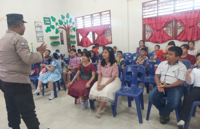 Dalam suasana yang akrab dan penuh keceriaan, AKP Zainuddin bersama personel lainnya memberikan bimbingan dan penyuluhan (Binluh) kepada anak yang hadir di aula sekolah minggu tersebut.